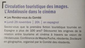 A lo largo de esa charla, integrada en las actividades organizadas por el Comité de Residentes del Colegio y su sección de Cultura, se analizarán las primeras representaciones de Andalucía en el cine con turistas. De ese modo, se pondrá de relieve que la interrelación entre turismo y cine en Andalucía se remonta a las primeras décadas del siglo veinte y que esas primeras imágenes de la región condicionaron su construcción identitaria para el turismo a lo largo de setenta años